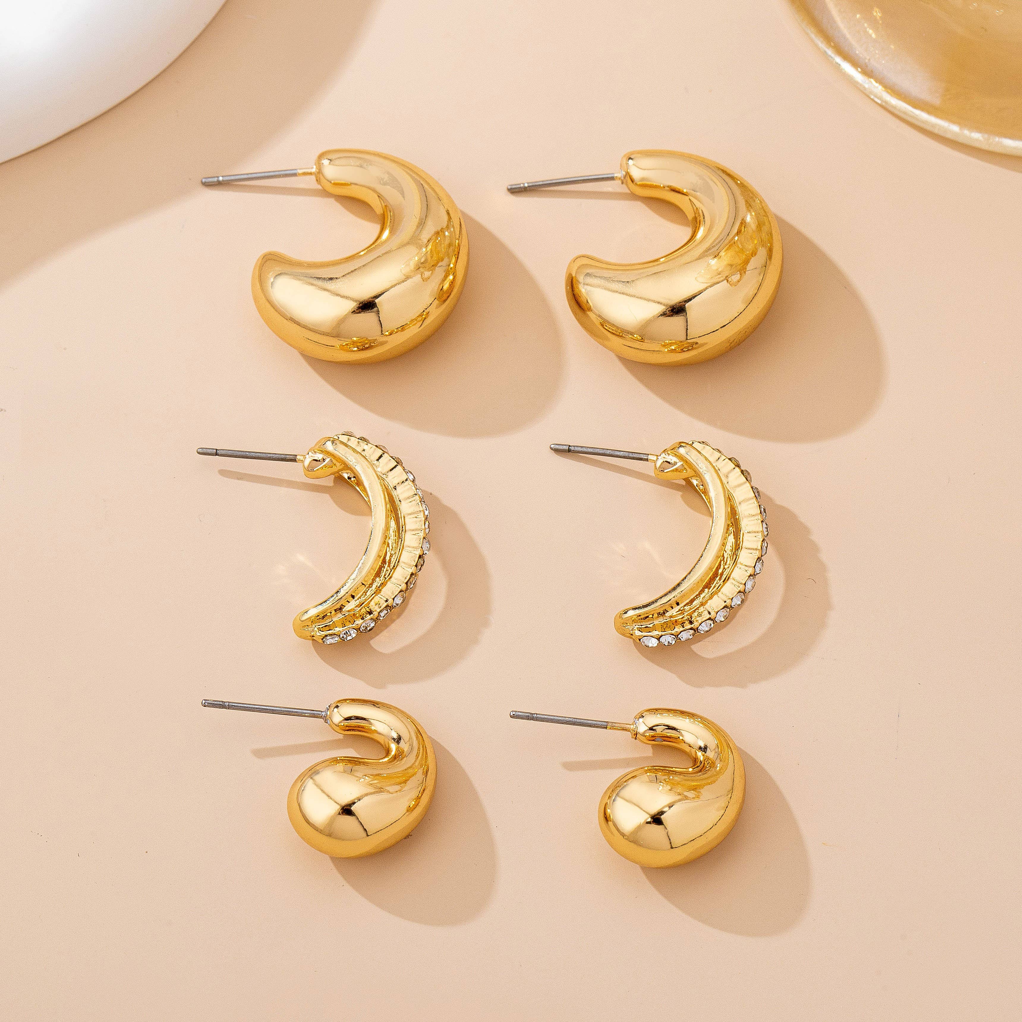 Gold-tone mix of bold dome hoops, mini tapered studs, and rhinestone double-band huggies for sleek, modern ear stacking.