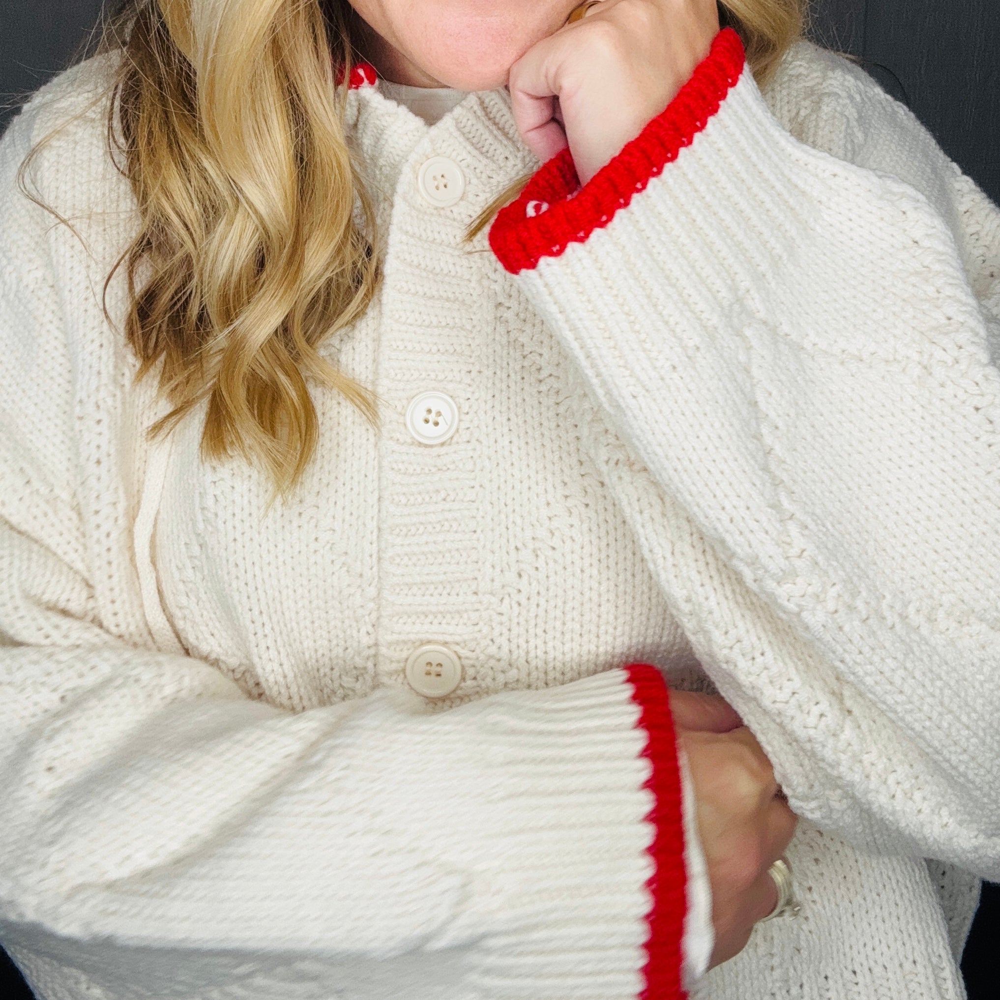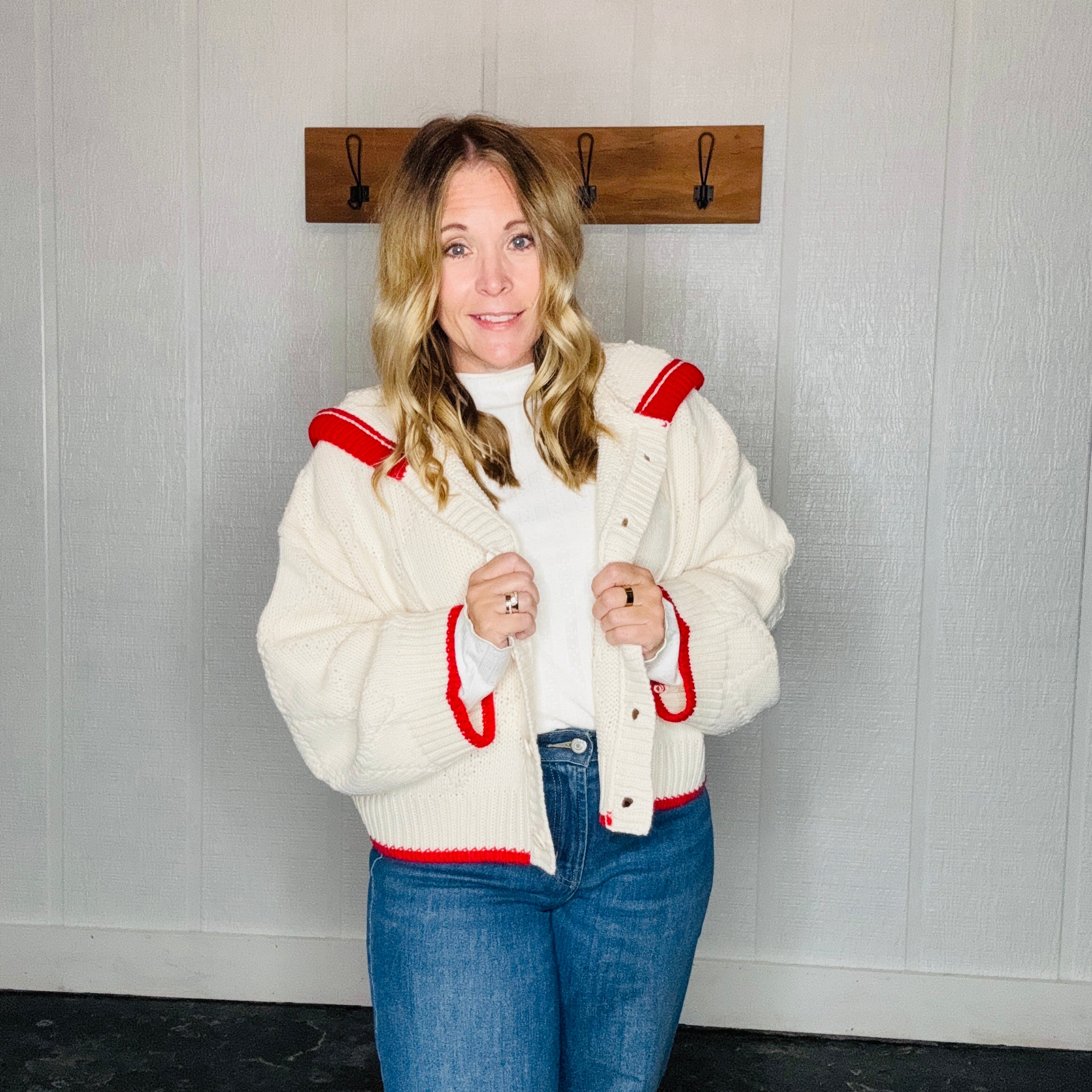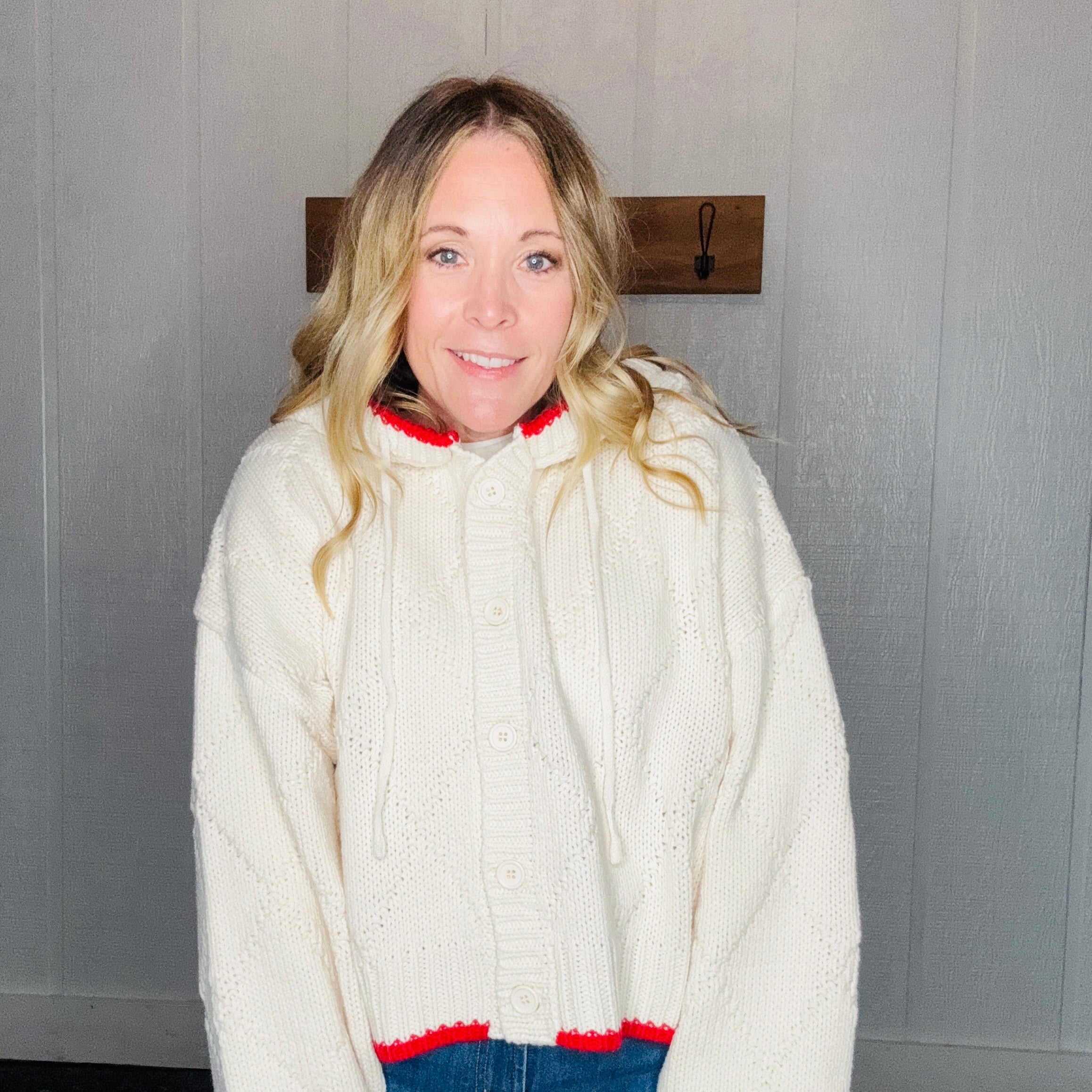 Cream/Red Color Contrasted Button Front Sweater Jacket with Hood