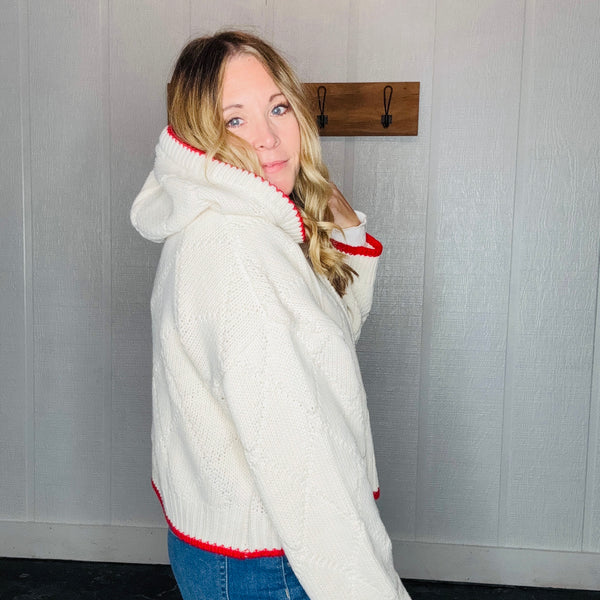 Cream/Red Color Contrasted Button Front Sweater Jacket with Hood