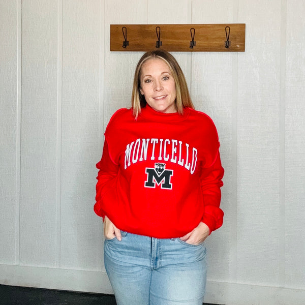 Oversized Mock Neck Sweatshirt. Customized with Monticello logo. The relaxed oversized fit has dropped shoulders. This mock neck delivers unmatched pride and comfort.  Fabric 65% Polyester 35% Cotton.