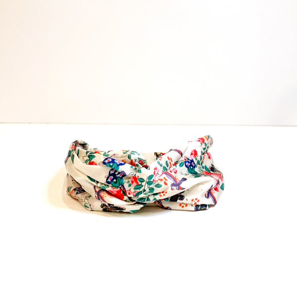 Pre-gathered twist headband; 100% polyester with covered elastic at back for snug/comfortable fit. No returns on clearance items.  All sales are final.
