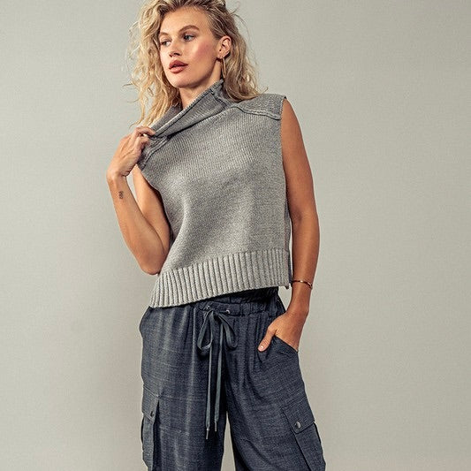 Crochet knit, cropped, sleeveless turtle neck sweater vest with exposed stitching detail and ribbed trim.